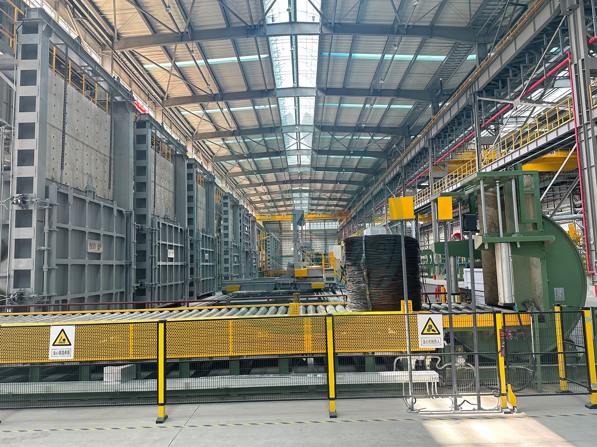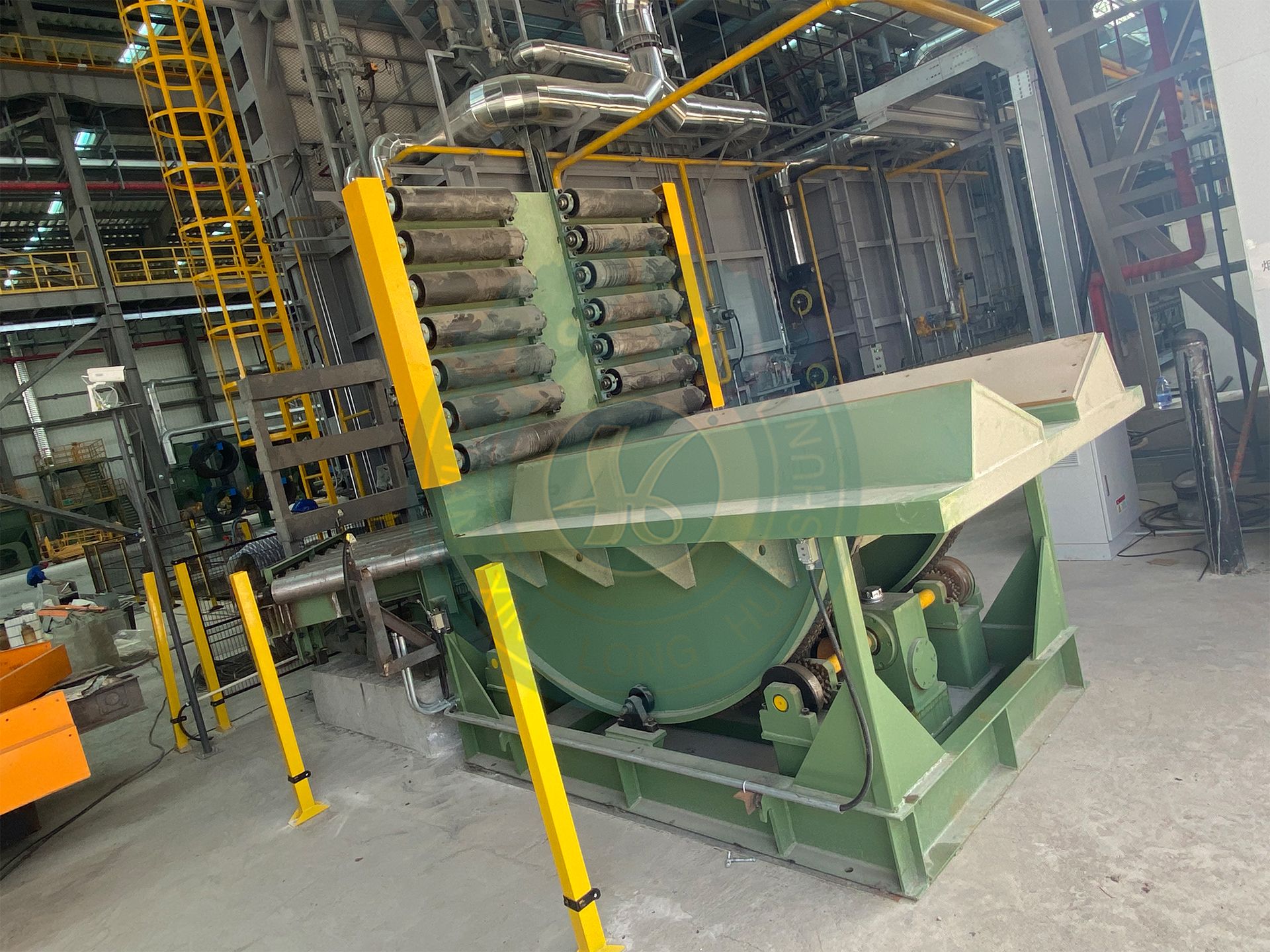 90度输送翻转机由两个台面组成:一面为输送辊道,一面为V型面,用于线材的90度输送翻转的作用;由人工或自动上料,输送线或人工自动下料,翻转机具备自动翻转功能(人工按钮确定),确保甲方生产过程中高效、安全。采用超强蜗轮蜗杆减速机使设备的传动动力,结构合理的四托轮机构承重使翻转平稳。90°翻转时,采用双重保护开关装置(限位开关、机械限位装置),上、下料时,翻转台面稳定(两边有固定压轮)。翻转完成后,翻转结束自动停车。