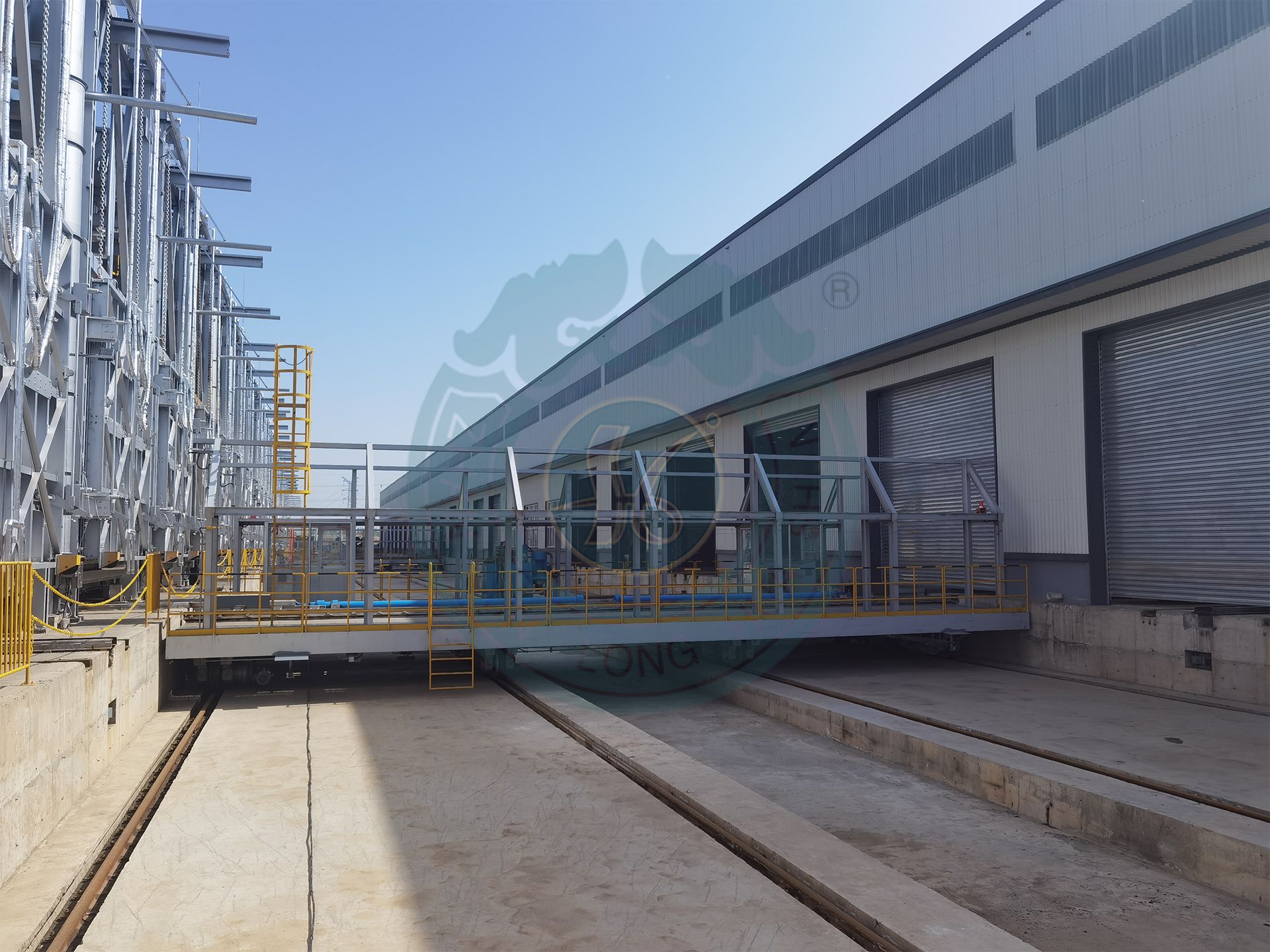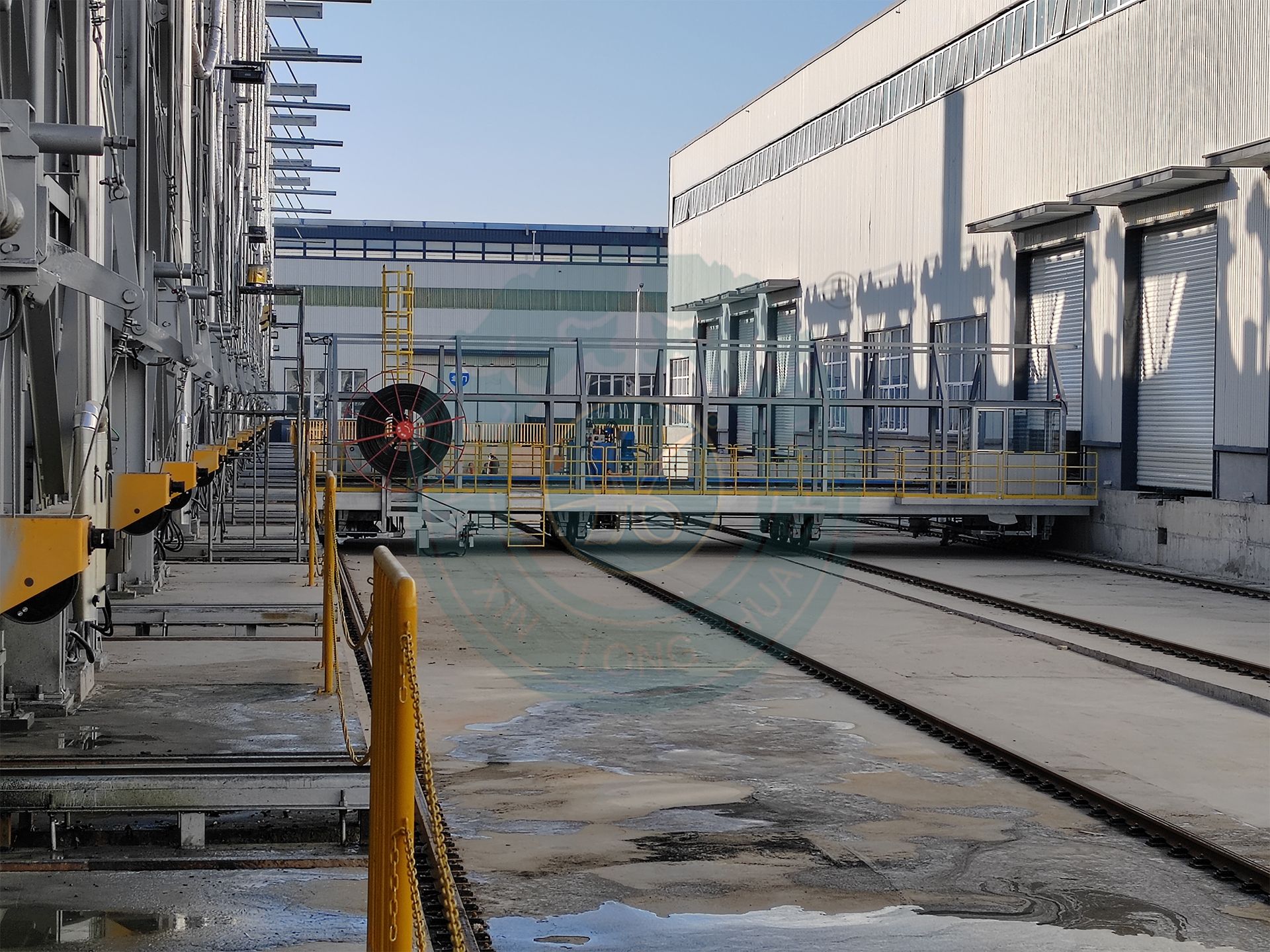 热处理炉群转运车主要是为了针对集群式热处理炉的工件出入及产品运转;车体由型钢、钢板等焊接成高强度的刚性结构,在设计上需充分考虑到钢架的整体强度、挠度、变形等问题,使钢结构结实耐用;每台转运车有双向两套推拉装置,用于驱动台车横向运动,两套定位装置,用于转运车精确定位(±5mm);转运车供电采用的磁滞式电缆卷筒;控制系统有自动和手动两种模式,自动状态下会根据预设进行定时定点工作,并配有障碍感知系统,遇到障碍时会自动停止;车载操作台上可以实现转运车单边运行;开放OPC接口。
