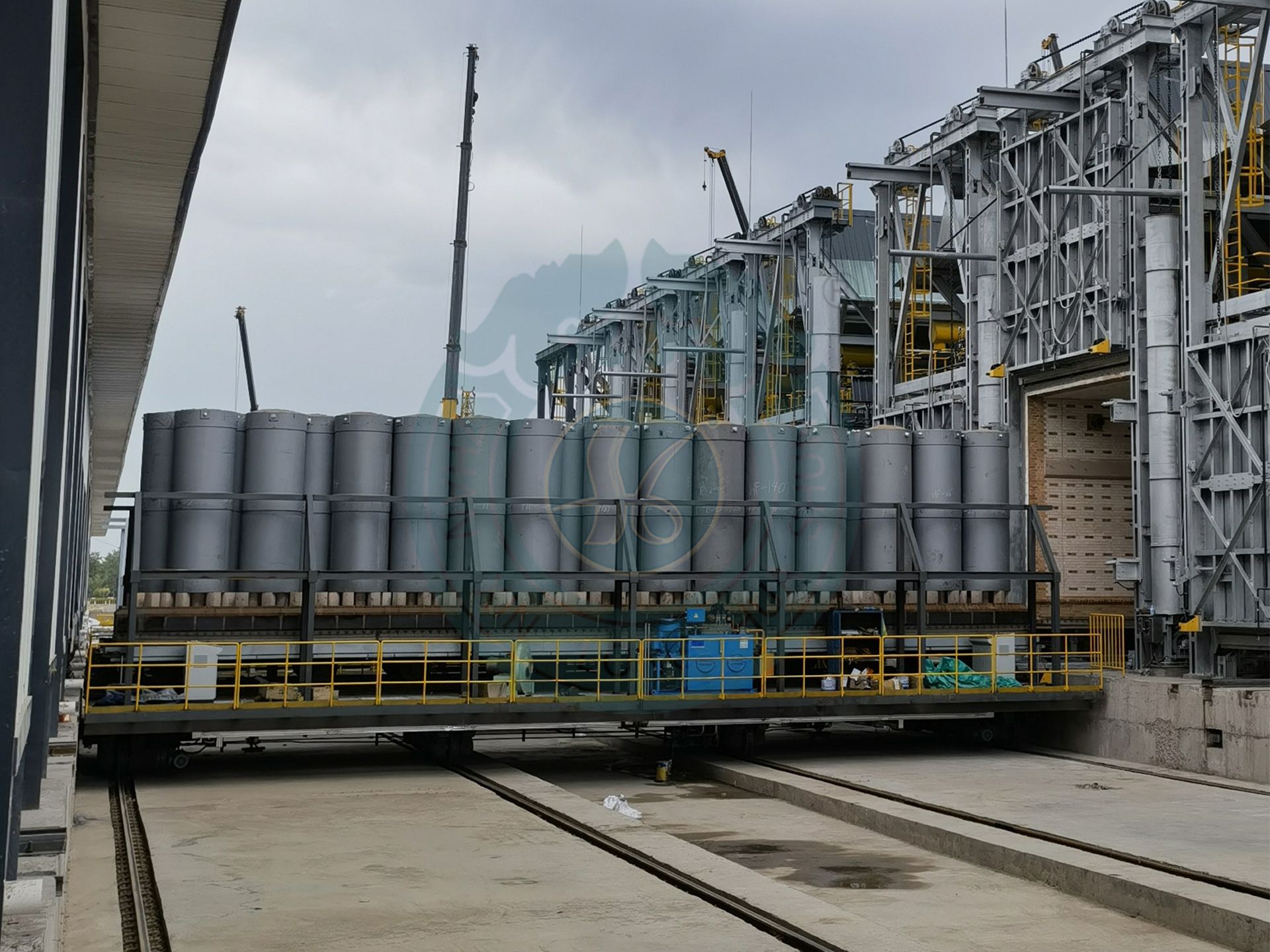 热处理炉群转运车主要是为了针对集群式热处理炉的工件出入及产品运转;车体由型钢、钢板等焊接成高强度的刚性结构,在设计上需充分考虑到钢架的整体强度、挠度、变形等问题,使钢结构结实耐用;每台转运车有双向两套推拉装置,用于驱动台车横向运动,两套定位装置,用于转运车精确定位(±5mm);转运车供电采用的磁滞式电缆卷筒;控制系统有自动和手动两种模式,自动状态下会根据预设进行定时定点工作,并配有障碍感知系统,遇到障碍时会自动停止;车载操作台上可以实现转运车单边运行;开放OPC接口。